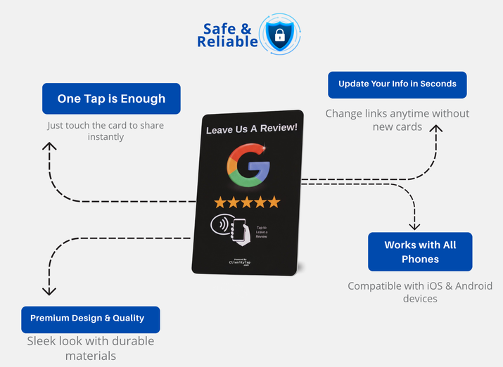 The G-ReviewBoost Card uses NFC + QR technology to let your customers instantly open your Google Review page with just one tap.